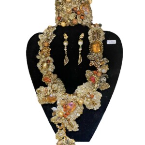 Detalles : Materiales: bordado, cahquirón de cristal Incluye collar , aretes y pulsera.