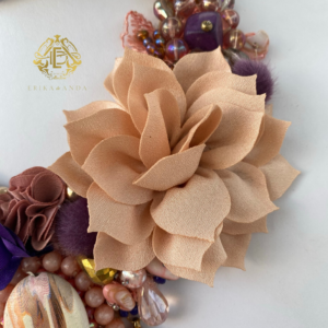 Materiales: chaquirón, perla sintética, cristal, dije de chifón, motas de hilo, flor de caucho.