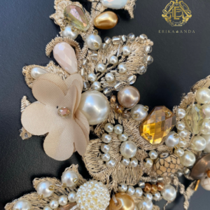 Materiales: chaquirón, perla sintética, flor de caucho, cristal.