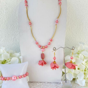 Materiales: chaquirón, perla sintética, flor de chifón, piedra natural, cristal. Incluye collar, aretes y una pulsera de regalo.