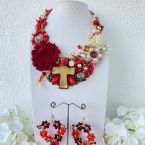 Materiales: chaquirón ,flor de chifón, cristal, cruz de metal, perlas sintéticas, pasta, bolas de metal. Incluye collar, aretes y una pulsera de regalo.