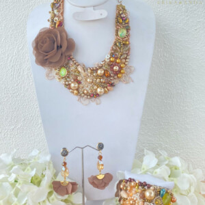 Materiales: chaquirón, perla sintética ,flor de chifón, cristal, motas de hilo, bolas de metal. Incluye collar, aretes y una pulsera de regalo.