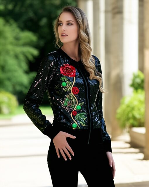 CHAMARRA DE LENTEJUELA NEGRA CON BORDADO EN ROJO