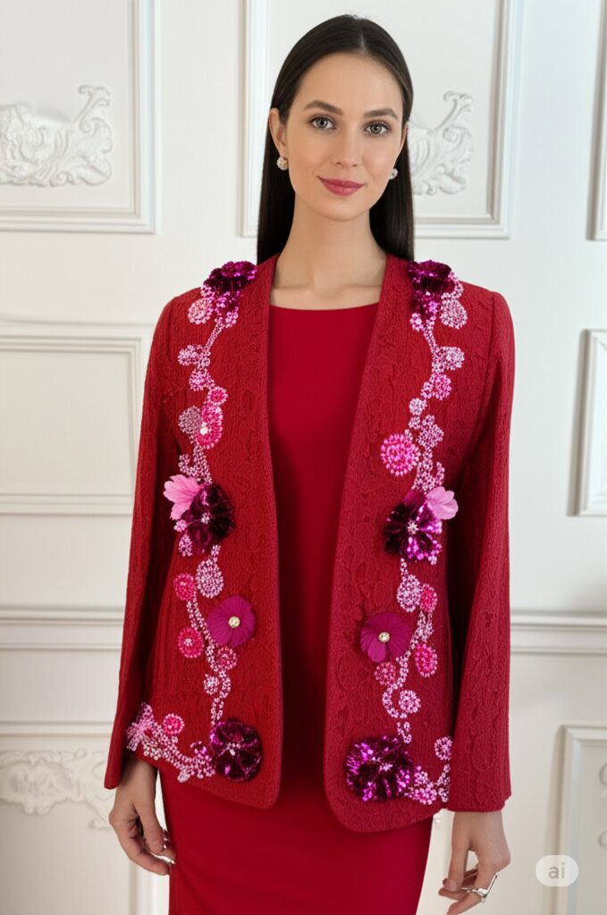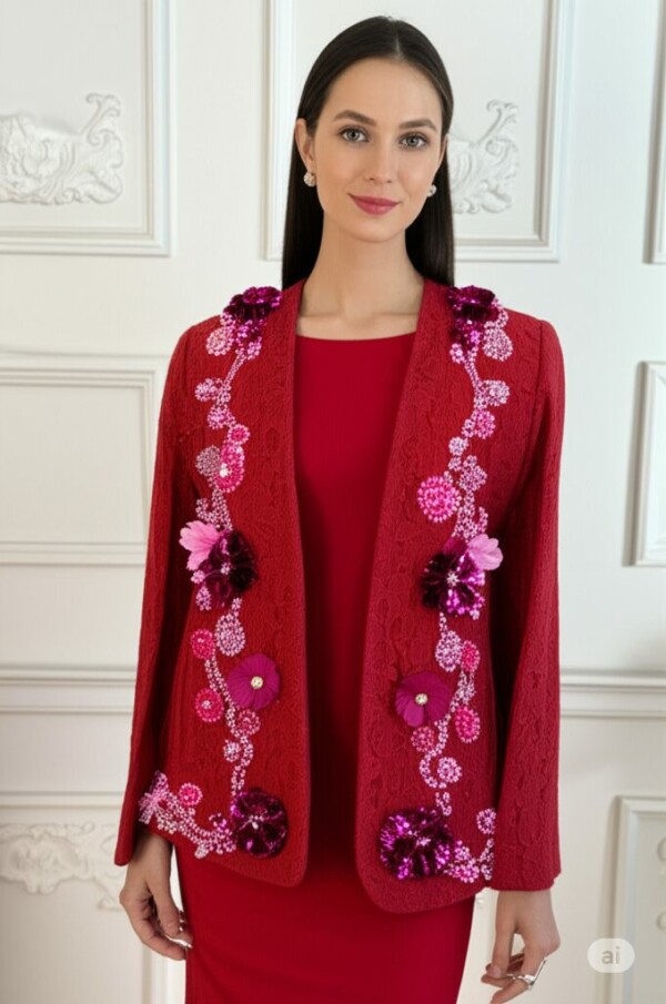 CHAQUETA ROJA CON BORDADO EN ROSA