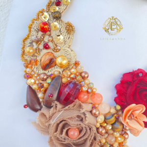 Materiales: chaquirón, perla sintética, flor de caucho, cristal, lentejuela, piedra natural, piedra acrílico, motas de hilo.