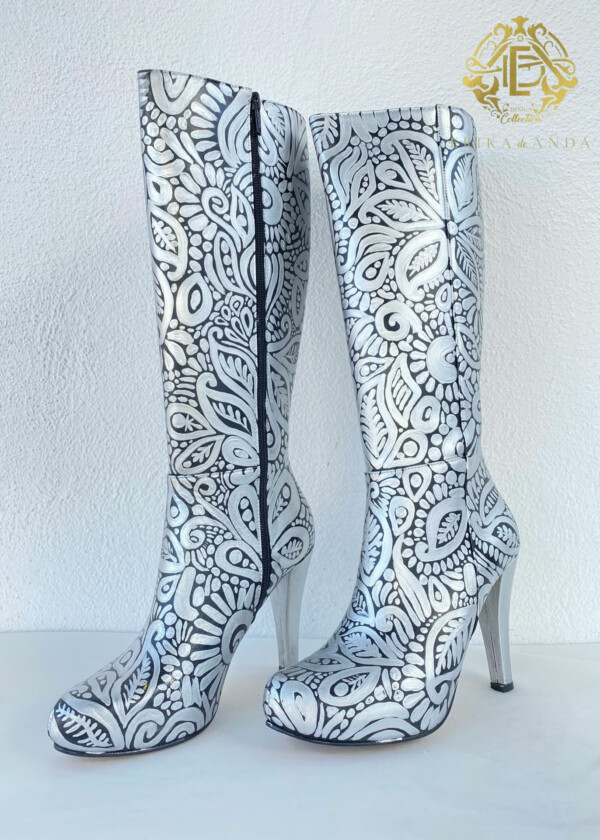BOTA DE PIEL PINTADA A MANO PLATEADA