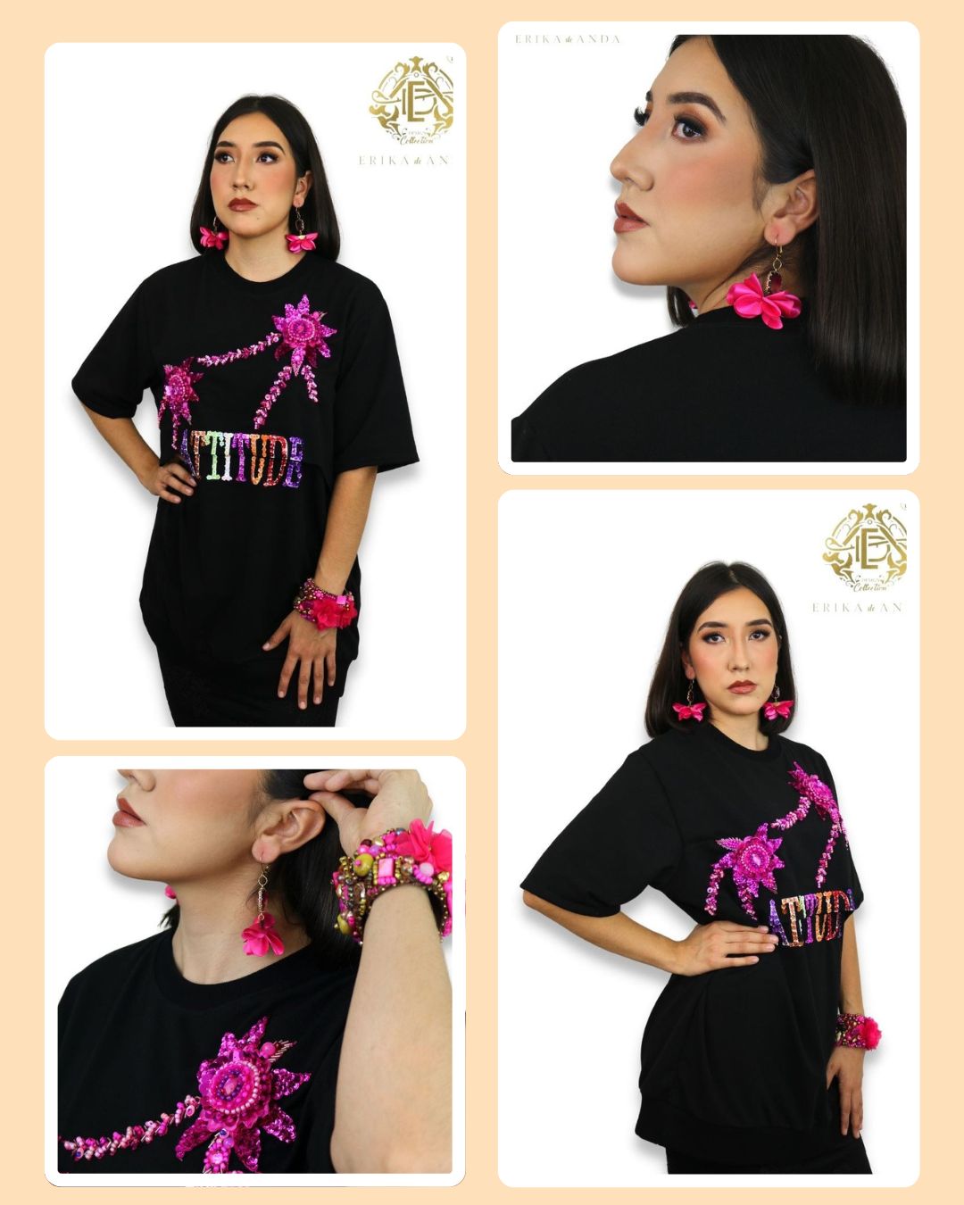 CAMISA NEGRA OVERSIZE CON BORDADO ROSADO