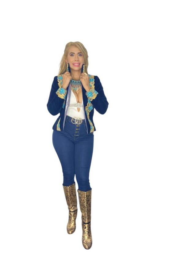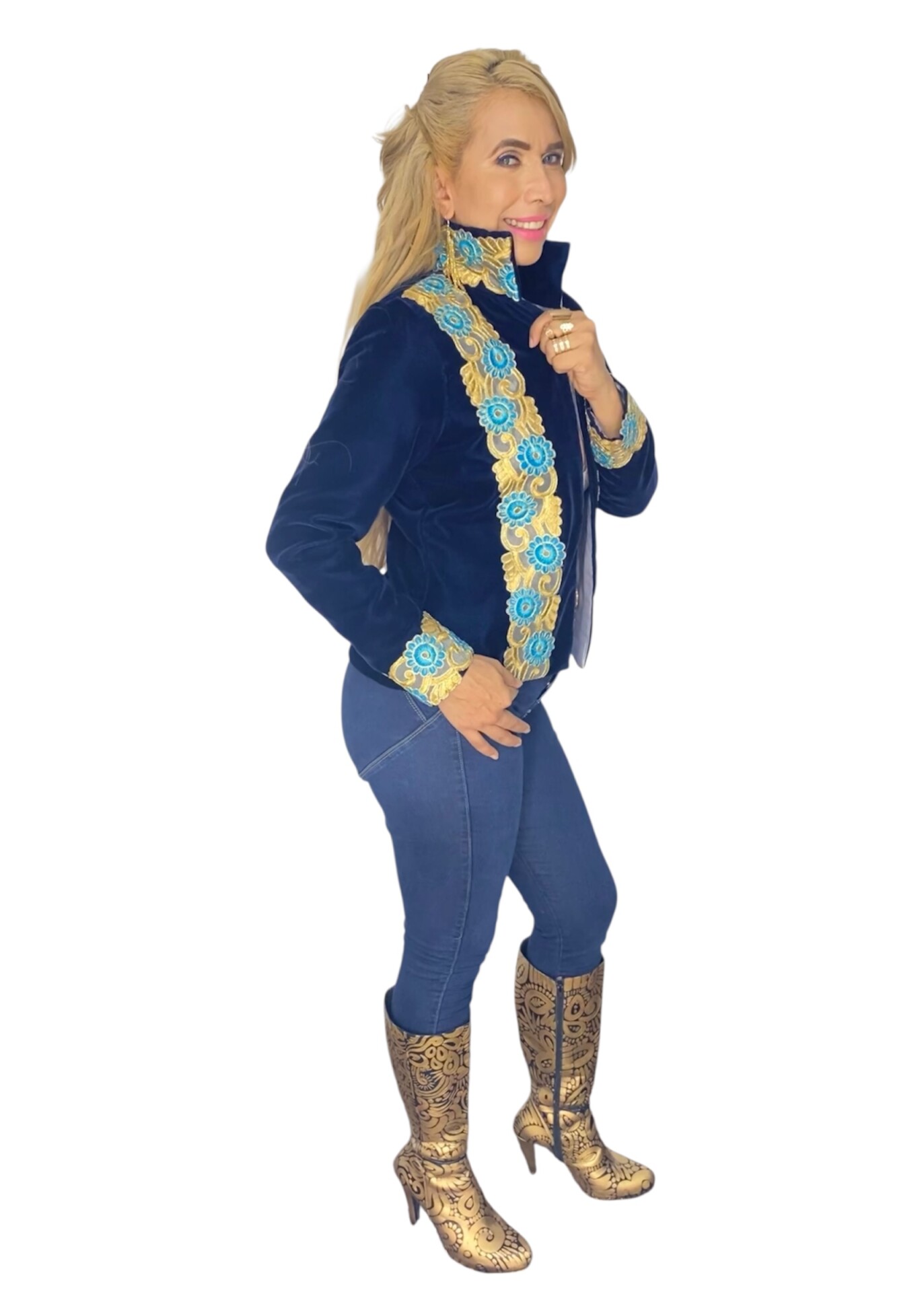 CHAMARRA TERCIOPELO AZUL FUERTE CON BORDADOS AZUL FLORAL