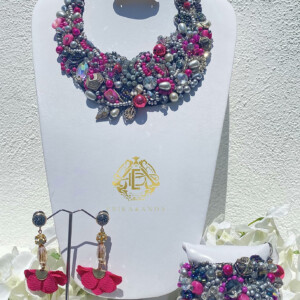 Incluye collar , aretes y pulsera. Nuestro producto es artesanal y 100% hecho por manos mexicanas ayudando a mujeres trabajadoras de nuestro país a preservar su forma de ingreso y cultura mexicana.