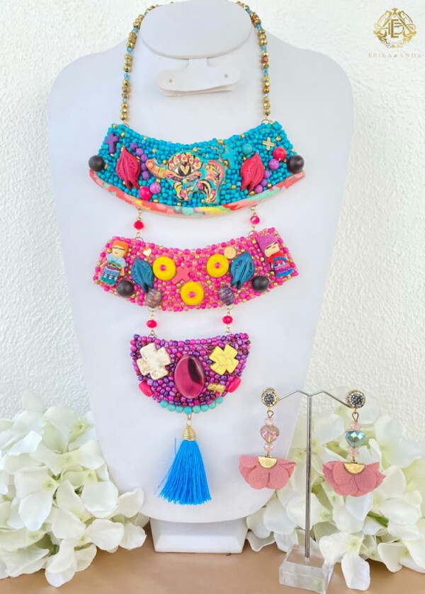 Incluye collar y aretes . Nuestro producto es artesanal y 100% hecho por manos mexicanas ayudando a mujeres trabajadoras de nuestro país a preservar su forma de ingreso y cultura mexicana.