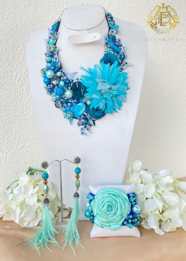 Detalles: Materiales: chaquirón, cristal, flor de chifón y perla sintética. Incluye collar, aretes y pulsera.