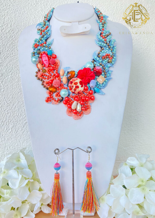 Detalles : Materiales: chaquirón, cristal, flor de chifón, piedras de acrílico, motas de hilo, semilla, porcelana mona pintado a mano Incluye collar y aretes.