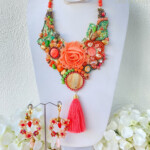 Detalles : Materiales: chaquirón, cristal, flor de chifón, piedras de acrílico, motas de hilo, semilla, porcelana mona pintado a mano Incluye collar y aretes.