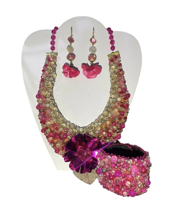 Detalles : Materiales: chaquirón, cristal, petate, piedra natural, dije de porcelana de corazón rosa, flor de chifón, motas de hilo, muñeca de tela. Incluye collar y aretes.