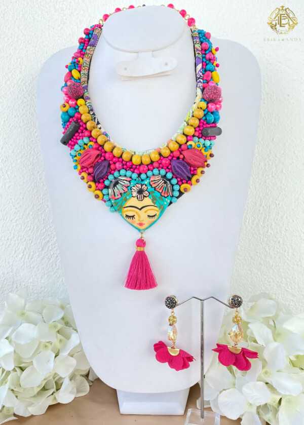 Detalles : Materiales: chaquirón, cristal, perlas sintéticas, madera, flor de chifón, motas de hilo, ojo de porcelana pintado a mano, cristal. Incluye collar y aretes .