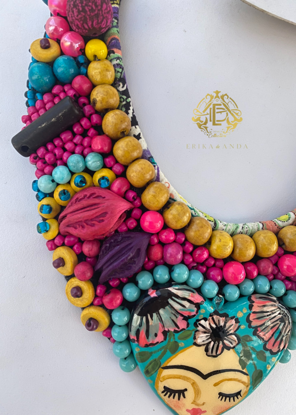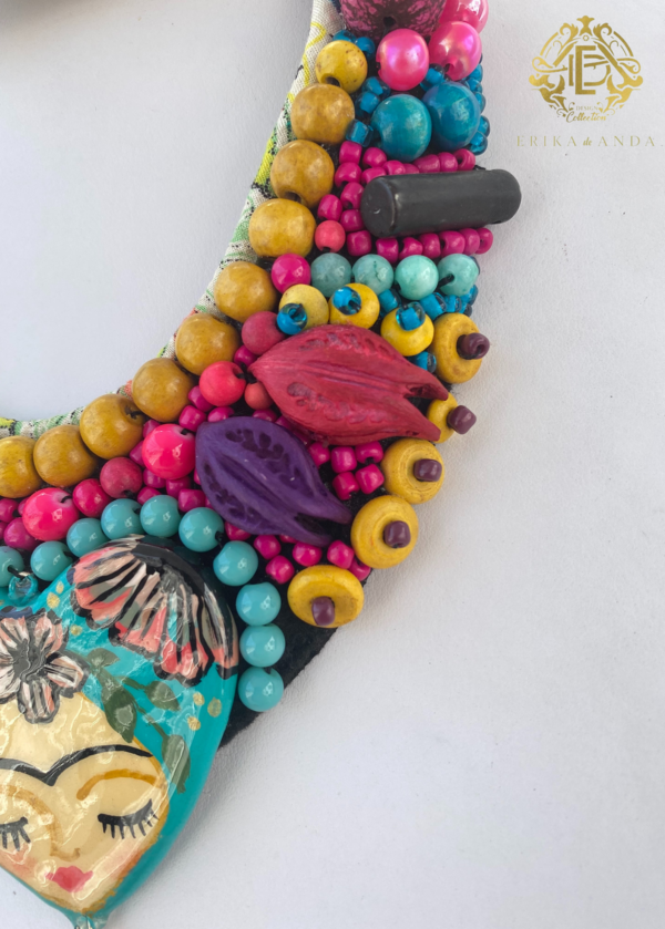 Detalles : Materiales: chaquirón, cristal, perlas sintéticas, flor de chifón, semillas naturales, metal, muñeco de tela, camadeo sintético, motas de hilo, dije de Frida calo con bordes de metal.