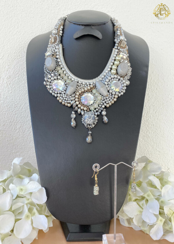 Detalles : Materiales: chaquirón, cristal, perlas sintéticas, dijes de metal, piedras naturales, motas de hilo. Incluye collar y aretes.
