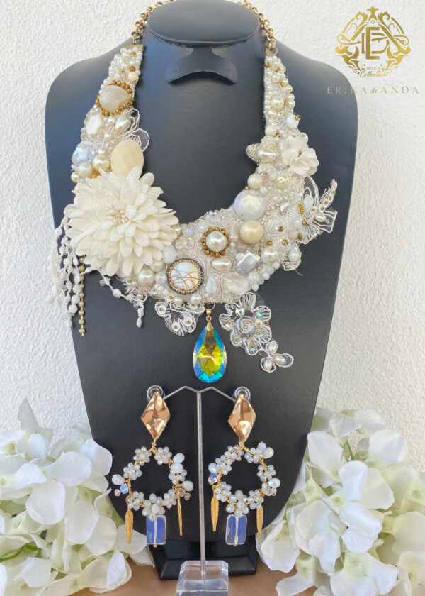 Detalles : Materiales: chaquirón, cristal, flor de chifón, piedras de acrílico, motas de hilo, semilla, porcelana mona pintado a mano Incluye collar y aretes.