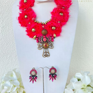 Detalles : Materiales: chaquirón, cristal, perlas sintéticas, flor de chifón, madera y motas de hilo Medidas: 15 cm aprox. Incluye collar y aretes.