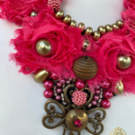 Detalles : Materiales: chaquirón, cristal, petate, piedra natural, dije de porcelana de corazón rosa, flor de chifón, motas de hilo, muñeca de tela. Incluye collar y aretes.