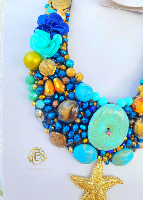 Materiales: chaquirón, perla sintética, cristal, piedra acrílico, piedra natural dije metal de estrella de mar, flor de chifón.