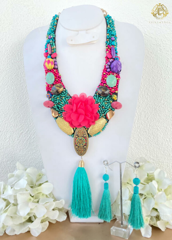 Detalles : Materiales: chaquirón, dije de metal, petate, cristal, flor de chifón, piedras de acrílico, pasta, madera, motas de hilo. Incluye collar y aretes.