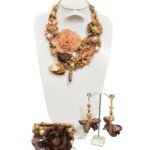 Detalles : Materiales: chaquirón, cristal, perlas sintéticas, flor de chifón, motas de hilo, cadena de metal, semillas naturales. Incluye collar y aretes.