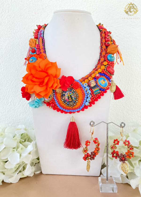 Incluye collar y aretes. Nuestro producto es artesanal y 100% hecho por manos mexicanas ayudando a mujeres trabajadoras de nuestro país a preservar su forma de ingreso y cultura mexicana.