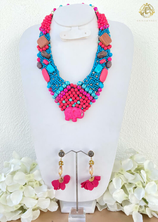 Detalles : Materiales: chaquirón, madera, cristal, piedra naturales, perlas sintéticas, madera, dije de elefante porcelana, motas de hilo. Incluye collar y aretes.