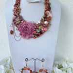 Detalles : Materiales: chaquirón, piedra de río, acrílico, perlas sintéticas, cristal, piedras naturales, piedras de acrílico, flor de chifón, motas de hilo. Incluye collar y aretes.