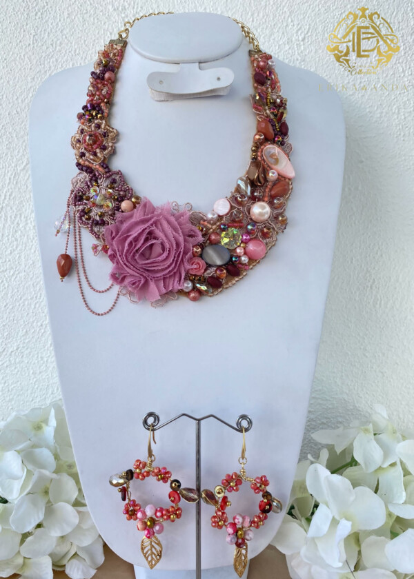 Detalles : Materiales: chaquirón, cristal, flor de chifón, piedras de acrílico, motas de hilo, semilla, porcelana mona pintado a mano Incluye collar y aretes.