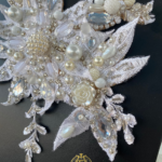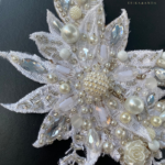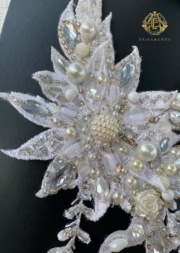 Materiales: chaquirón, perla sintética, flor de caucho, cristal, motas de hilo, escamas de pescando.