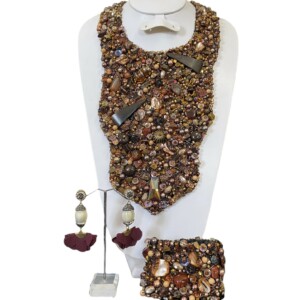 Detalles : Materiales: chaquirón, cristal, perlas sintéticas, motas de hilo, metal, piedra de natural, piedra acrílico. Incluye collar y aretes.