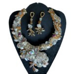 Detalles : Materiales: chaquirón, piedra de río, acrílico, perlas sintéticas, cristal, piedras naturales, piedras de acrílico, flor de chifón, motas de hilo. Incluye collar y aretes.