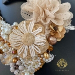 Materiales: chaquirón, perla sintética ,flor de chifón, cristal, motas de hilo, piedra de acrílico.