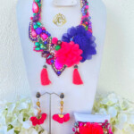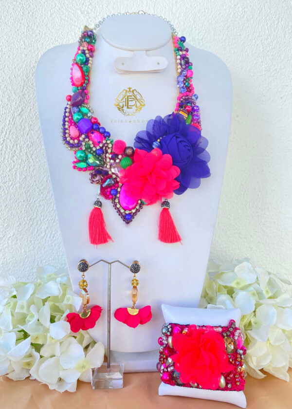 Incluye collar, aretes y pulsera. Nuestro producto es artesanal y 100% hecho por manos mexicanas ayudando a mujeres trabajadoras de nuestro país a preservar su forma de ingreso y cultura mexicana.