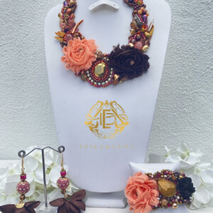 Detalles: Materiales: chaquirón, cristal, acrílico y flor de chifón. Incluye collar, aretes y pulsera.