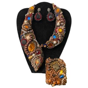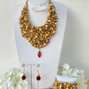 Detalles: Materiales: chaquirón y cristal. Incluye collar, aretes y pulsera.