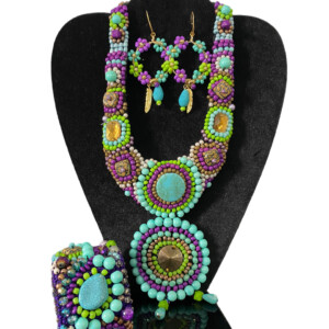 Incluye collar , aretes y pulsera. Nuestro producto es artesanal y 100% hecho por manos mexicanas ayudando a mujeres trabajadoras de nuestro país a preservar su forma de ingreso y cultura mexicana.