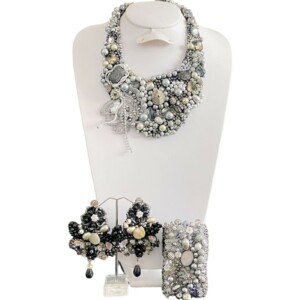 Detalles: Materiales: chaquirón, cristal, perla sintética, metal y acrílico. Incluye collar, aretes y pulsera.
