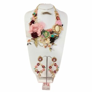 Detalles: Materiales: chaquirón, cristal, flor de chifón, perla sintético, acrílico. Incluye collar, aretes y pulsera.