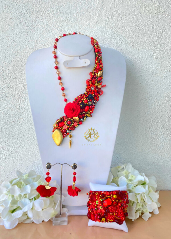 Incluye collar y aretes. Nuestro producto es artesanal y 100% hecho por manos mexicanas ayudando a mujeres trabajadoras de nuestro país a preservar su forma de ingreso y cultura mexicana.