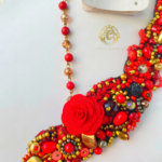 Materiales: chaquirón, perla sintética, flor de caucho, cristal, lentejuela, piedra natural, piedra acrílico, motas de hilo.