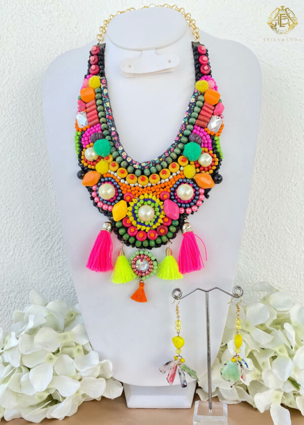 Incluye collar y aretes . Nuestro producto es artesanal y 100% hecho por manos mexicanas ayudando a mujeres trabajadoras de nuestro país a preservar su forma de ingreso y cultura mexicana.
