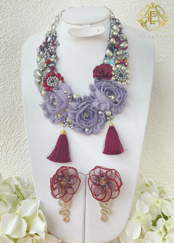Detalles : Materiales: chaquirón, cristal, flor de chifón, piedras de acrílico, motas de hilo, semilla, porcelana mona pintado a mano Incluye collar y aretes.