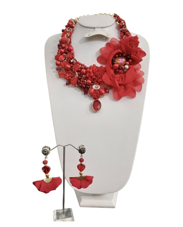 Detalles : Materiales: chaquirón, cristal, flor de chifón, piedras de acrílico, motas de hilo, semilla, porcelana mona pintado a mano Incluye collar y aretes.