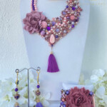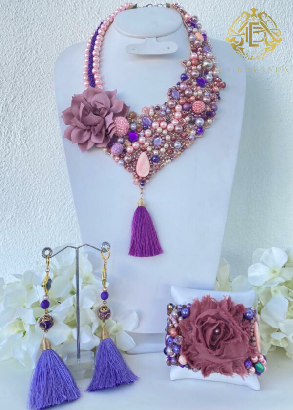 Detalles : Materiales: chaquirón, cristal, flor de chifón, petate, acrílico, motas de hilo, acrílico dije de metal, pasta. Incluye collar y aretes.