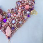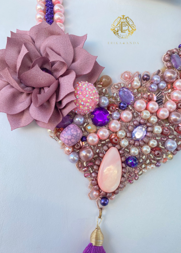 Detalles : Materiales: chaquirón, cristal, petate, piedra natural, dije de porcelana de corazón rosa, flor de chifón, motas de hilo, muñeca de tela. Incluye collar y aretes.
