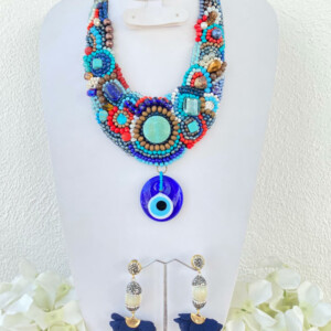 Detalles : Materiales: chaquirón, cristal, piedra natural, dije acrílico de ojo, pompon de estambre, dije de ojo pintado a mano, motas de hilo Incluye collar y aretes.