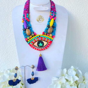 Detalles : Materiales: chaquirón, cristal, perlas sintéticas, madera, flor de chifón, motas de hilo, ojo de porcelana pintado a mano, cristal. Incluye collar y aretes .